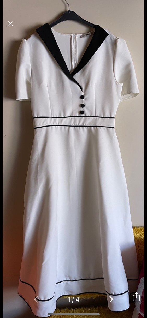 Beyaz midi elbise, V yaka ve düğmeli detaylara sahiptir. Kısa kollu, düzenli kesim ve modern klasik tarzda, ofis için uygundur. Desensiz ve siyah ince şerit detaylıdır. Temiz ve hasarsız nikah elbisesi olarak da geçiyor