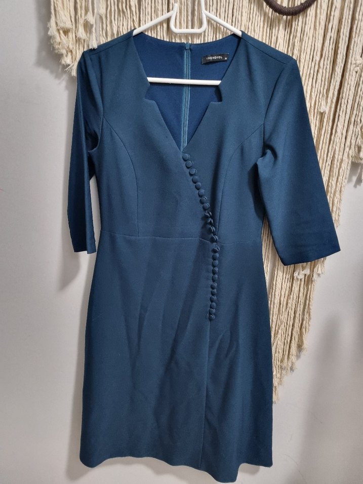 Lacivert midi elbise, V yaka ve düğme detaylıdır. Üç çeyrek kollu, normal kesim ve modern klasik stilde, ofis kullanımı için de uygundur. İç astarı vardır. yeni
