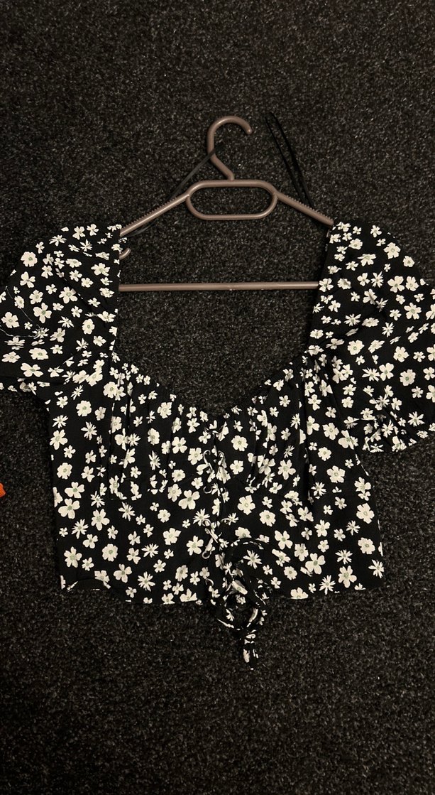 V yaka, kısa kollu, düğmeli ve çiçek desenli siyah mini bluz, bohem tarzda, triko kumaştan.