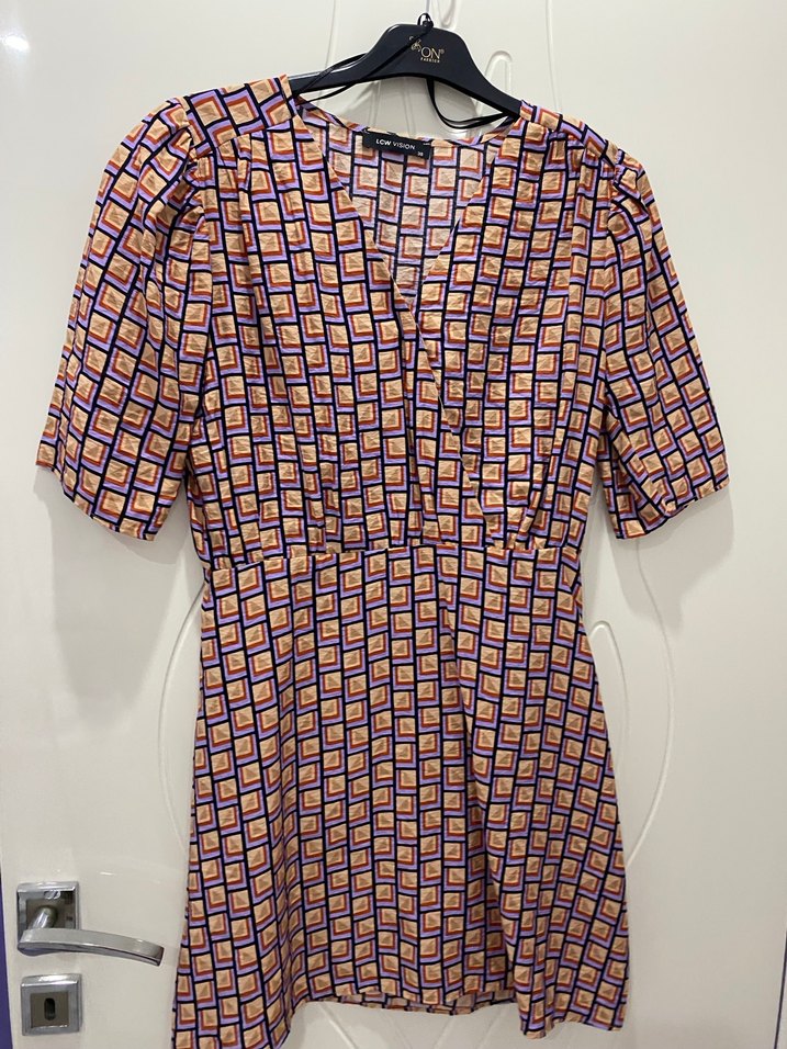 Renkli desenli, düğmeli, V yaka kısa kollu, vücuda oturan mini elbise. Sentetik kumaştan üretilmiş, günlük sokak stili için uygun.