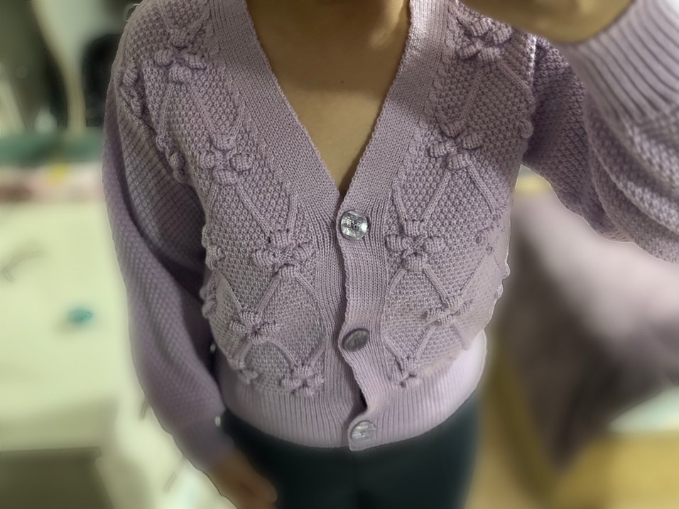 Mor renkli triko hırka, V yaka ve düğmeli kapama özelliğine sahiptir. Bol kesim, uzun kollu ve dokulu örgü deseni ile gündelik kullanıma uygundur. standart beden