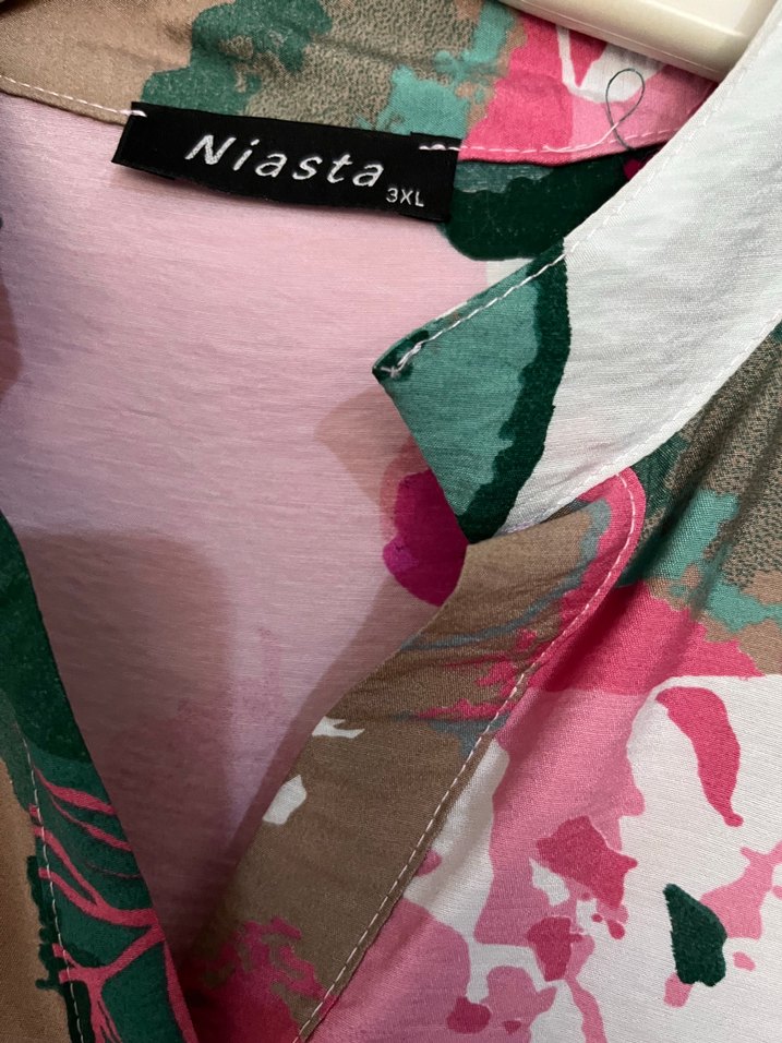 Yumuşak sentetik kumaştan, düğmeli V yaka, kısa kollu, pastel pembe çiçek desenli bol kesim elbise. Günlük rahat kullanım için uygundur.