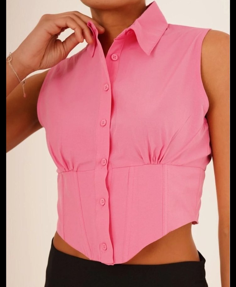 Düğmeli, V yakalı, kolu olmayan pembe gömlek. Normal boyda, fit kesim ve günlük sokak stili, ofis için uygundur.