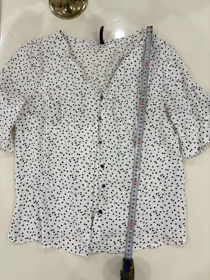 Düğmeli, kısa kollu, V yakalı, bol kesim kadın bluz. Sentetik kumaştan, beyaz zemin üzerine gri puantiyeli, midi boyda ve günlük kullanıma uygun. Chima marka puantiyeli gömlek kolları fırfır detaylı v yaka duruşu gayet güzel cici bir görünüm veren gömlektir ihtiyacı olan alabilir görselleri inceleyiniz s/m 65 kiloya kadar olur ürün çok diyor ama bedeni bir tık küçük
