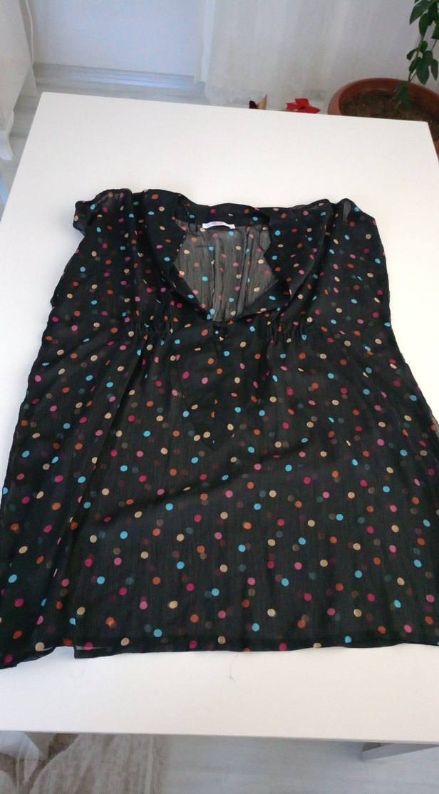Düğmeli, V yakalı, çok renkli puantiyeli desenli pareo. Rahat kesimli, kolsuz ve yumuşak sentetik kumaştan üretilmiştir.