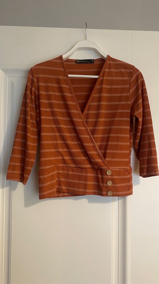 Pudra, uzun kollu, düğmeli ve V yakalı bu bluz, rahat kesimi ve midi boy uzunluğuyla günlük sokak stiline uygundur.