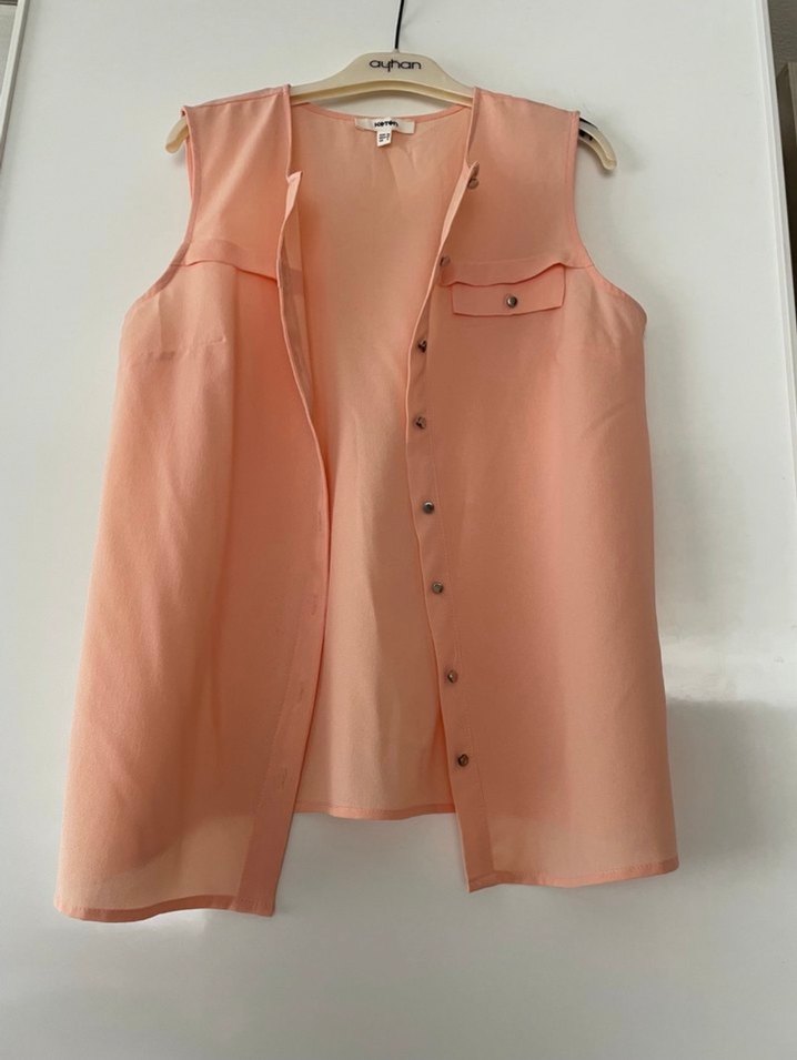 Düğmeli ön kısmı ve V yakası olan pudra renkli kolsuz bluz. Yumuşak sentetik kumaştan, salaş kesim ve midi boyda, günlük sokak stili için uygun.