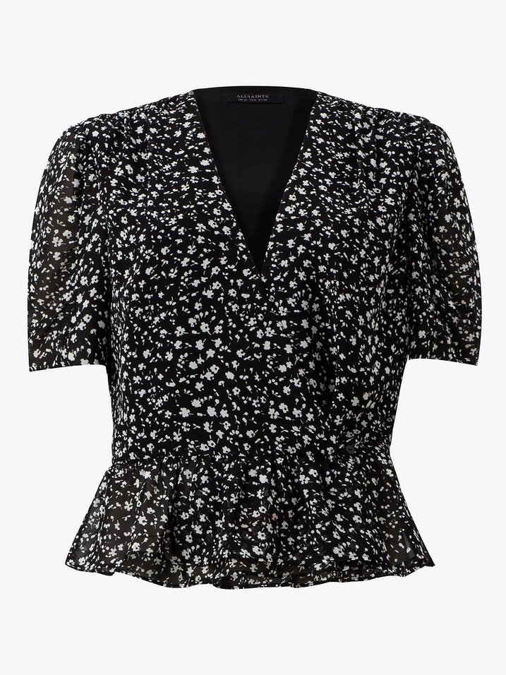 Düğmeli, V yaka ve kısa kollu bu siyah bluz, koyu çiçekli desen ve midi boyda. Ofis için uygun, sentetik kumaştan üretilmiş, gotik ve Paris tarzını yansıtıyor.