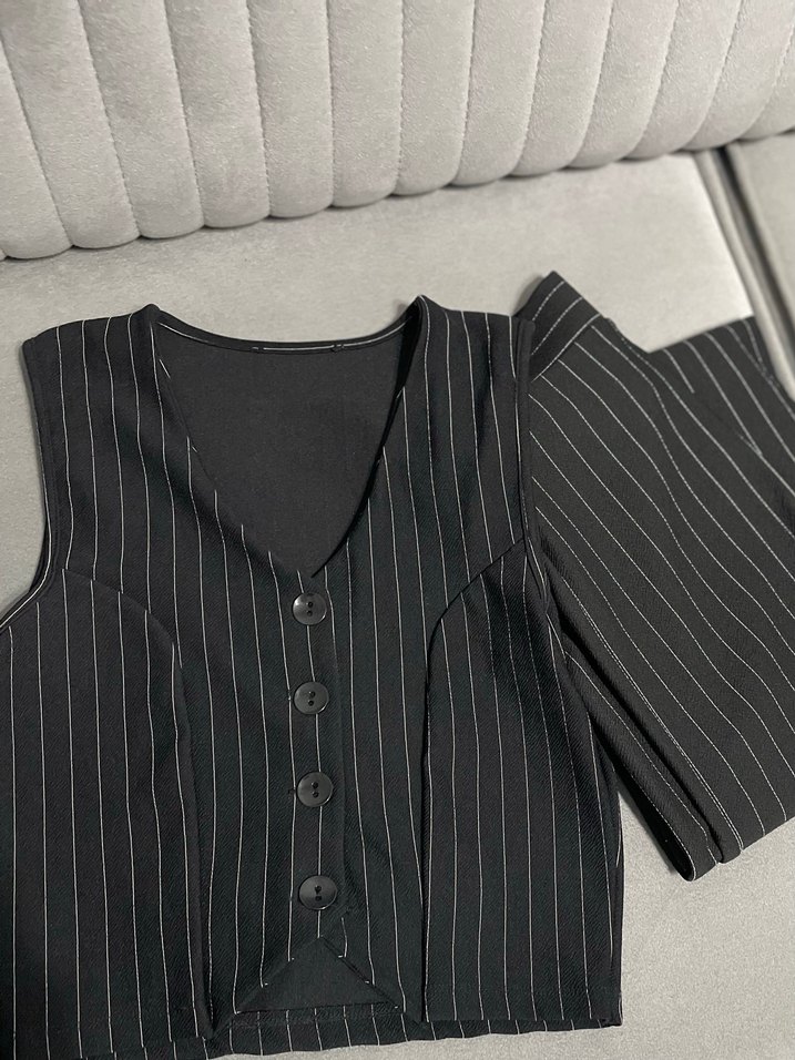 Düğmeli ön kısmı, V yaka, siyah üzerine ince gri çizgili, kolsuz ve regular fit kadın yelek. Midi boy, ofis için uygun.
