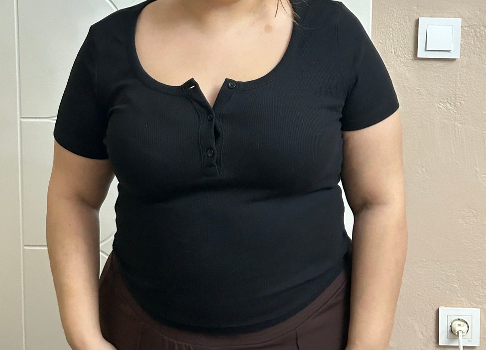Düğmeli V yaka ve kısa kollu, pamuklu siyah hamile tişörtü. Normal boyda, dar kesim ve minimalist tarzda günlük kullanım için uygundur.