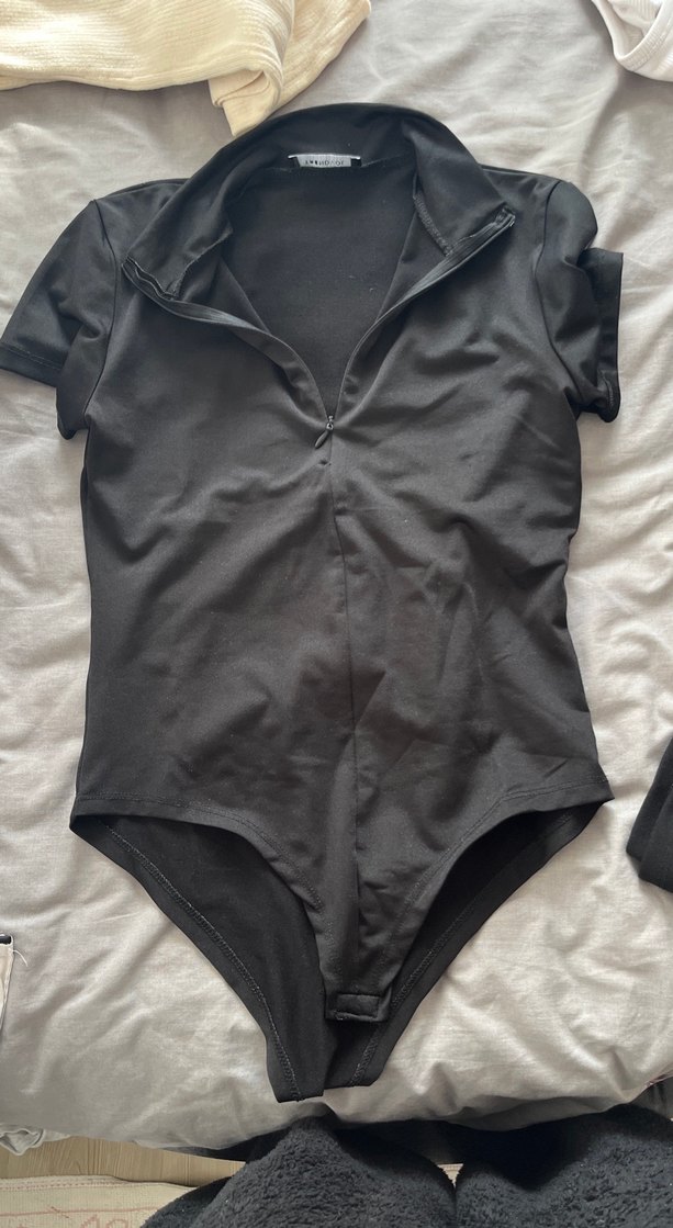 Siyah, düğmeli, V yakalı, kısa kollu, sentetik kumaştan yapılmış, dar kesim kadın bluz. Sokak stili ve günlük kullanım için uygundur.