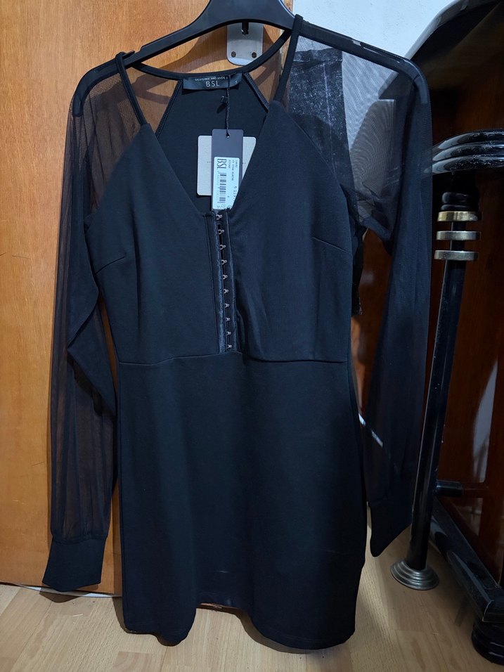 V yaka, uzun tül kollar ve düğme detaylı siyah, vücuda oturan midi elbise, gotik tarz için uygundur.