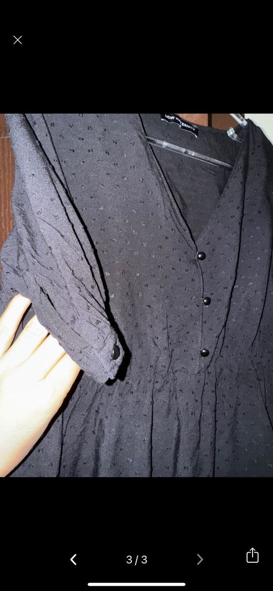 Düğmeli, V yakalı, kısa kollu, midi boy siyah bluzu. Rahat kalıp ve yumuşak sentetik kumaştan yapılmıştır.