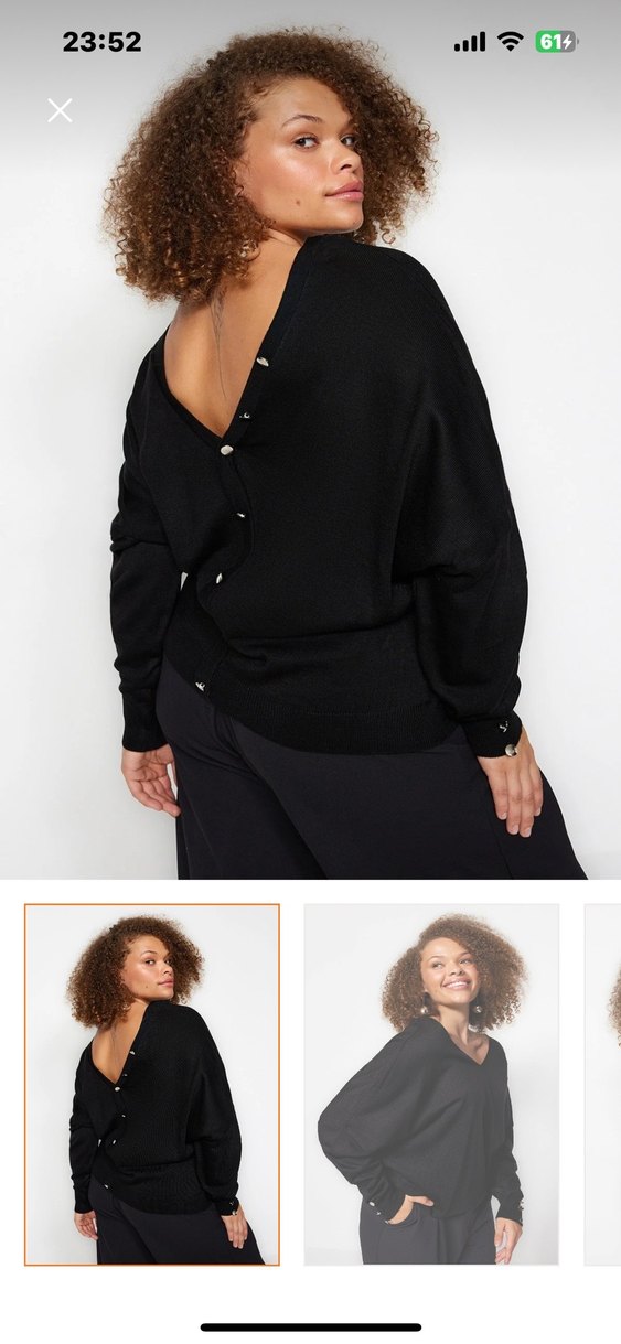 Sırtında düğmeli V yaka, uzun kollu, rahat kesim ve ipeksi dokulu siyah kadın kazak. Günlük sokak stili için uygun.