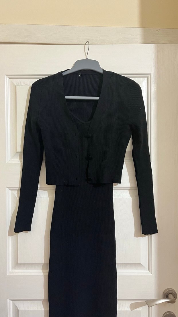Düğmeli, V yakalı, uzun kollu siyah triko elbise. Sentetik yumuşak kumaştan, minimalist gotik tarzı yansıtır. Bir kere giyildi