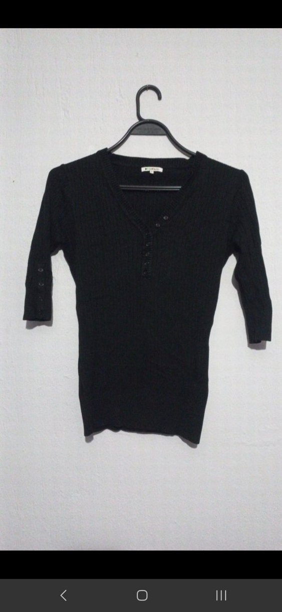 Düğmeli uzun kollu, V yaka ve dar kesim siyah triko kazak, günlük kullanıma uygun rahat bir parça.