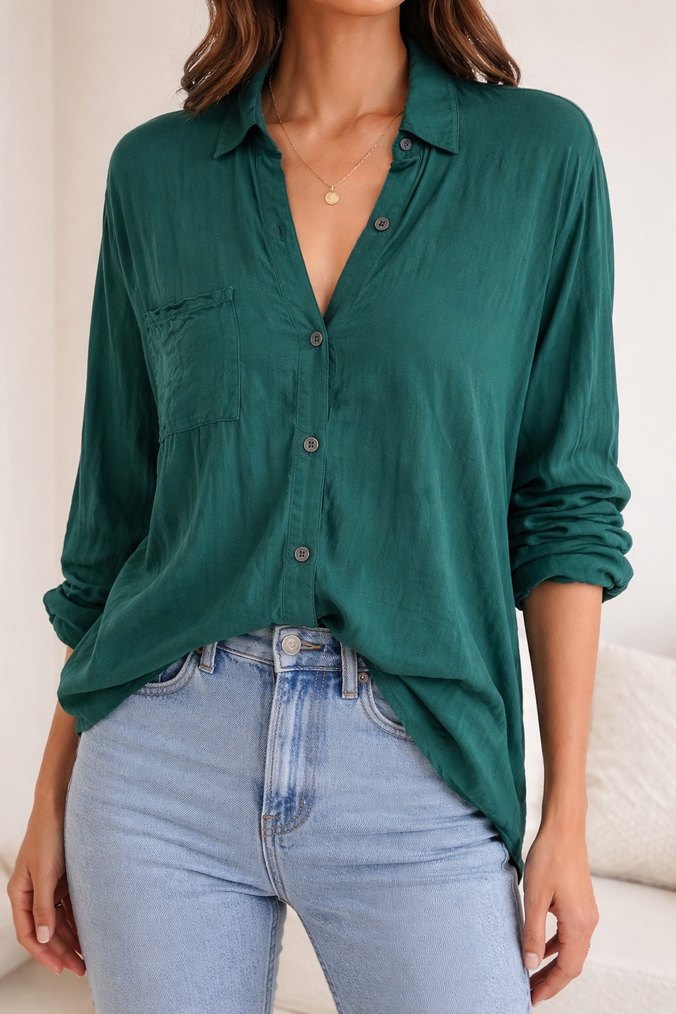 Düğmeli ön kısmı ve V yakası olan bol kesim, uzun kollu kadın gömleği. Yumuşak keten kumaştan yapılmış, koyu turkuaz renkte ve normal midi boyda, günlük rahat kullanım için uygundur.