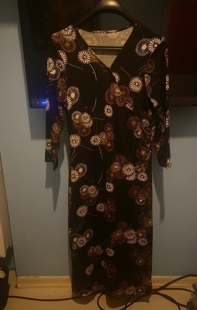 Koyu kahverengi baskılı, düğmeli, uzun kollu ve V yakalı, sentetik kumaştan yapılmış dar kesim uzun vintage elbise. Bohem tarzıyla romantik akşamlar için uygun.