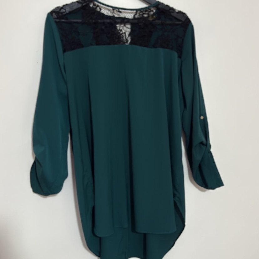 Düğmeli uzun kollu, v yaka ve bol kesim olan bu bluz, sentetik yumuşak kumaştan üretilmiştir. Üst kısmında dantel detayı bulunur, ofis için uygundur.