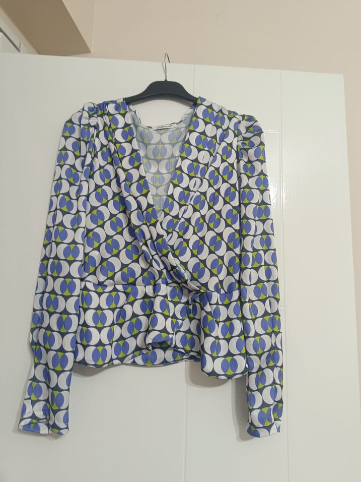 Kadınlar için V yakalı, uzun kollu, bol kesim ve kısa boylu bluz. Mavi ve gri batik desenli, düğmeli, sentetik kumaştan yapılmış, günlük kullanıma uygun.