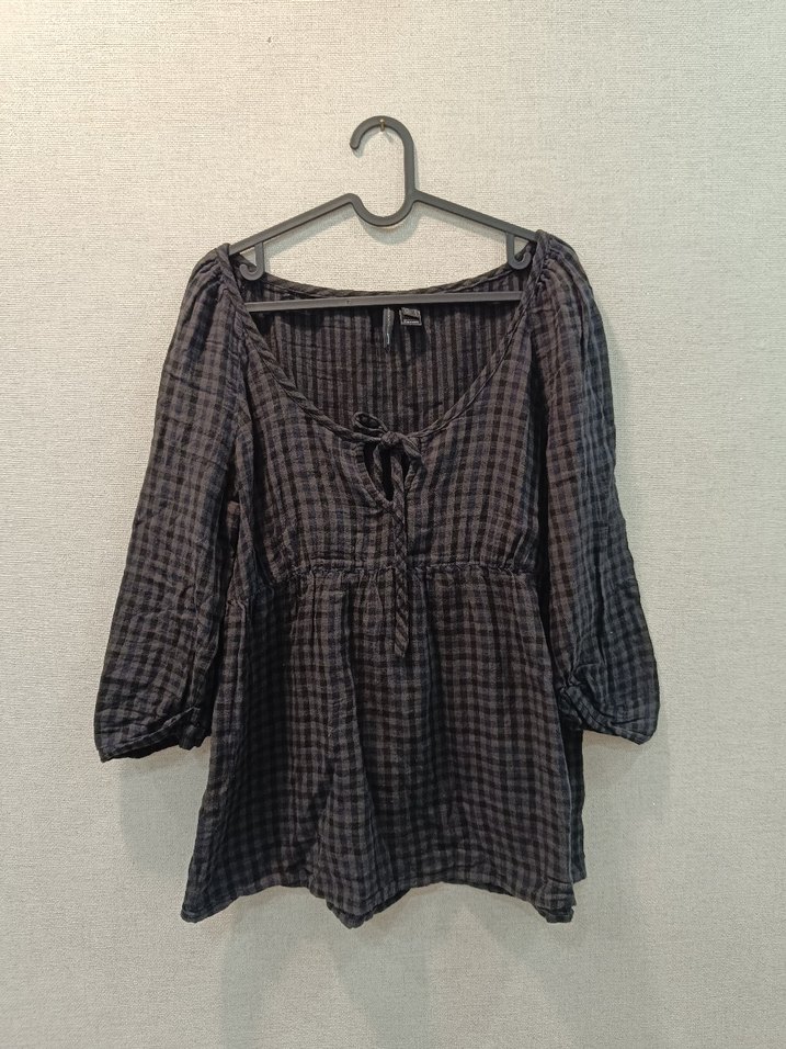 Nefes alabilen keten kumaştan yapılmış, yumuşacık düğmeli ve V yakalı, uzun kollu, bol kesim kahverengi bluz. Günlük kullanıma uygun, koyu renkli batik desenli.