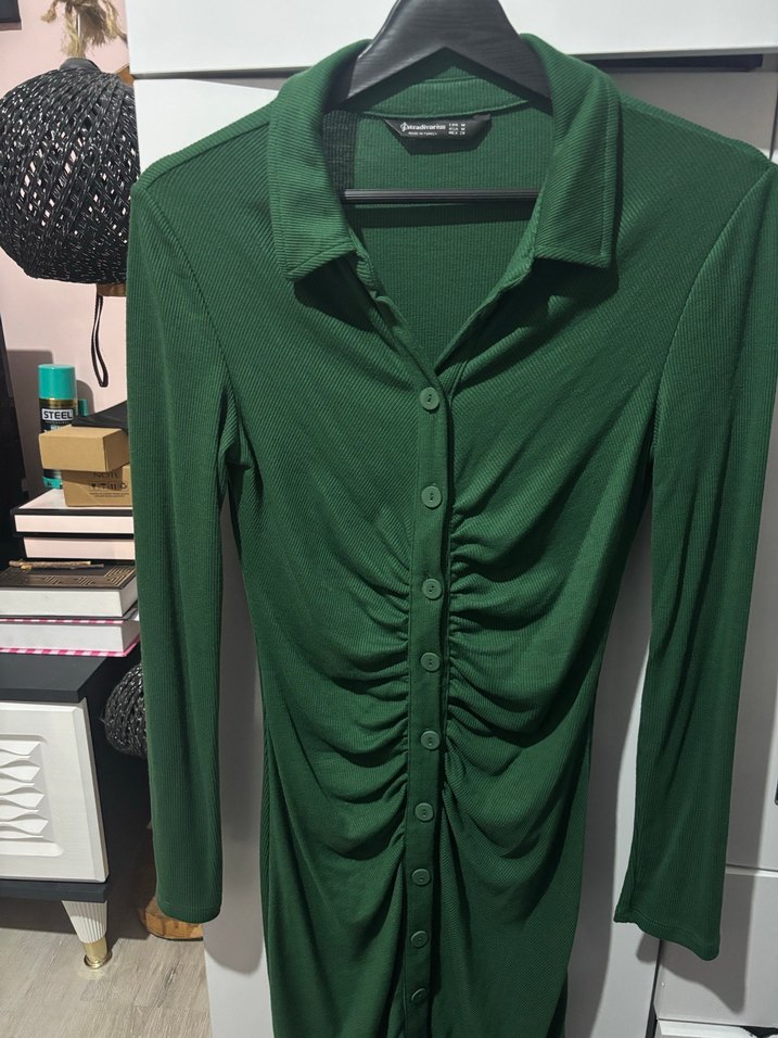 Düğmeli, V yaka ve uzun kollu bu yeşil elbise, ön kısmında büzgülü detay ve uzun boy ile günlük kullanıma uygun yumuşak sentetik kumaştan üretilmiştir. S,M,L beden uyumludur full likradır