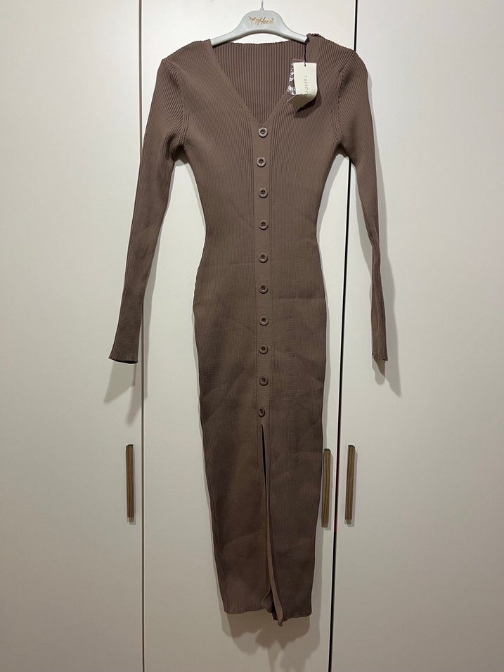 Düğmeli ön kısmı ve uzun kollu, v yaka, kahverengi tonlarında triko elbisedir. Minimalist tasarımıyla gündelik kullanıma uygundur.