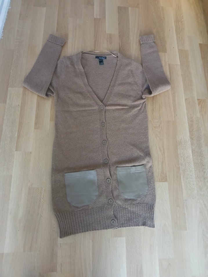 Tarçın rengi, cepleri deri detaylı uzun hırka