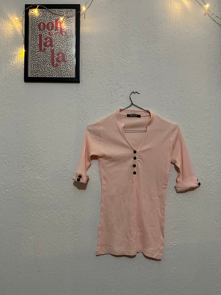 Yavruağzı kadın tişörtü, düğmeli V yaka ve düğmeli yarım kollu. Pamuklu yumuşak kumaştır. Boy 58 en 30 kol 27 cm #Y2K
