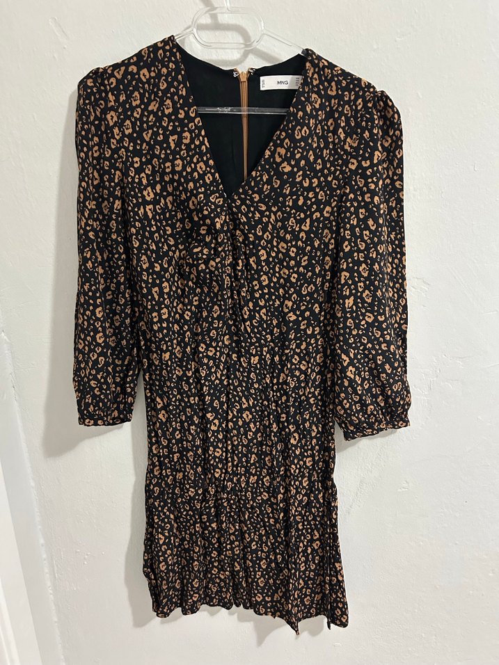 Düğmeli, V yaka, uzun kollu, koyu kahverengi yılan desenli, sentetik kumaştan bohem tarzda mini elbise.