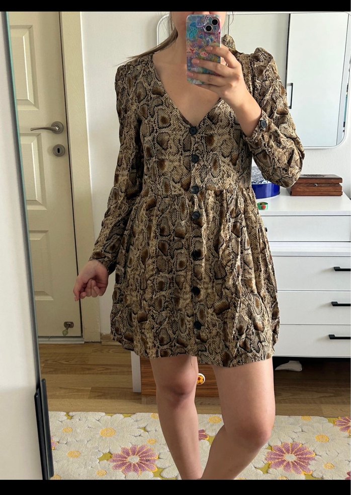 Düğmeli V Yaka Yılan Desenli Zara M Elbise