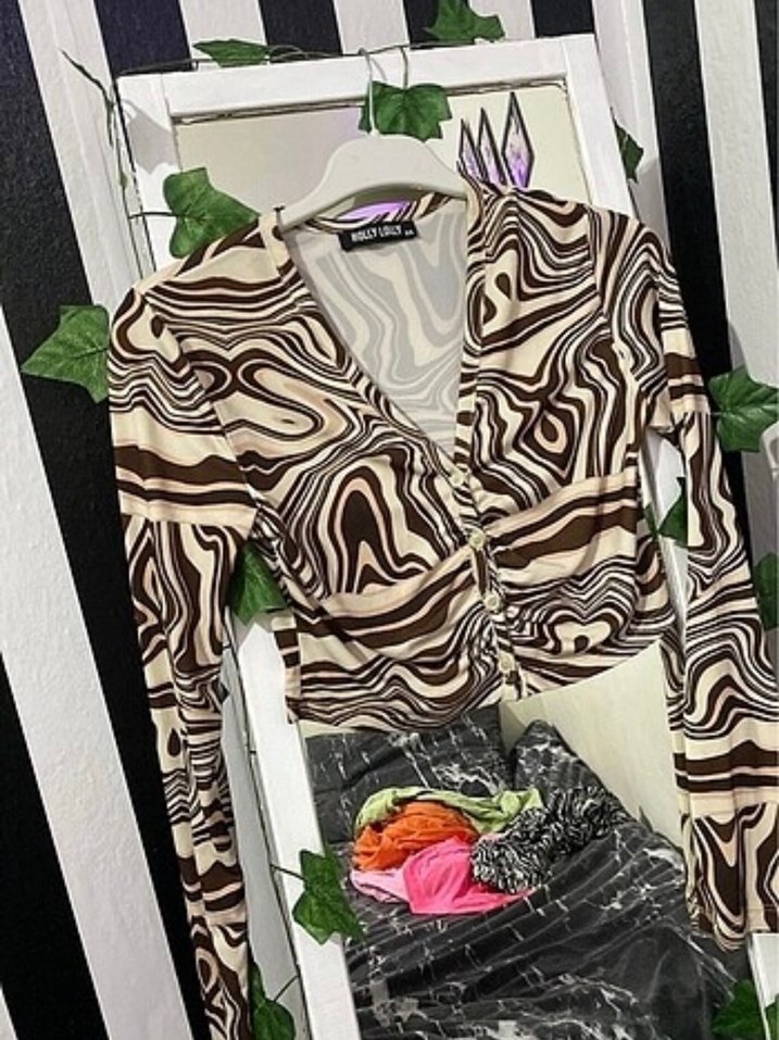 Düğmeli, V yakalı, uzun kollu, mini boy, kahverengi zebra desenli, bohem ve retro tarzına uygun kadın bluz.