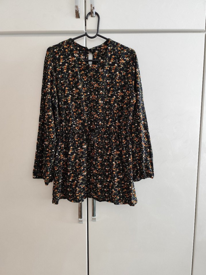 Uzun kollu, V yakalı, düğmeli ve bağcıklı, koyu renkli çok renkli tie-dye desenli bol kesim bluz. Sentetik kumaştan, günlük kullanım için uygun.