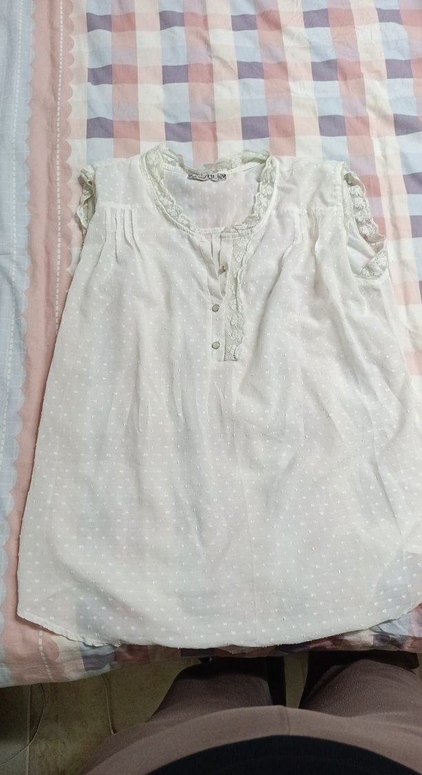 Pamuk kumaştan, düğmeli V yakalı, kolsuz ve bol kesim beyaz hamile bluzu. Vintage bohem tarzıyla günlük kullanıma uygundur.