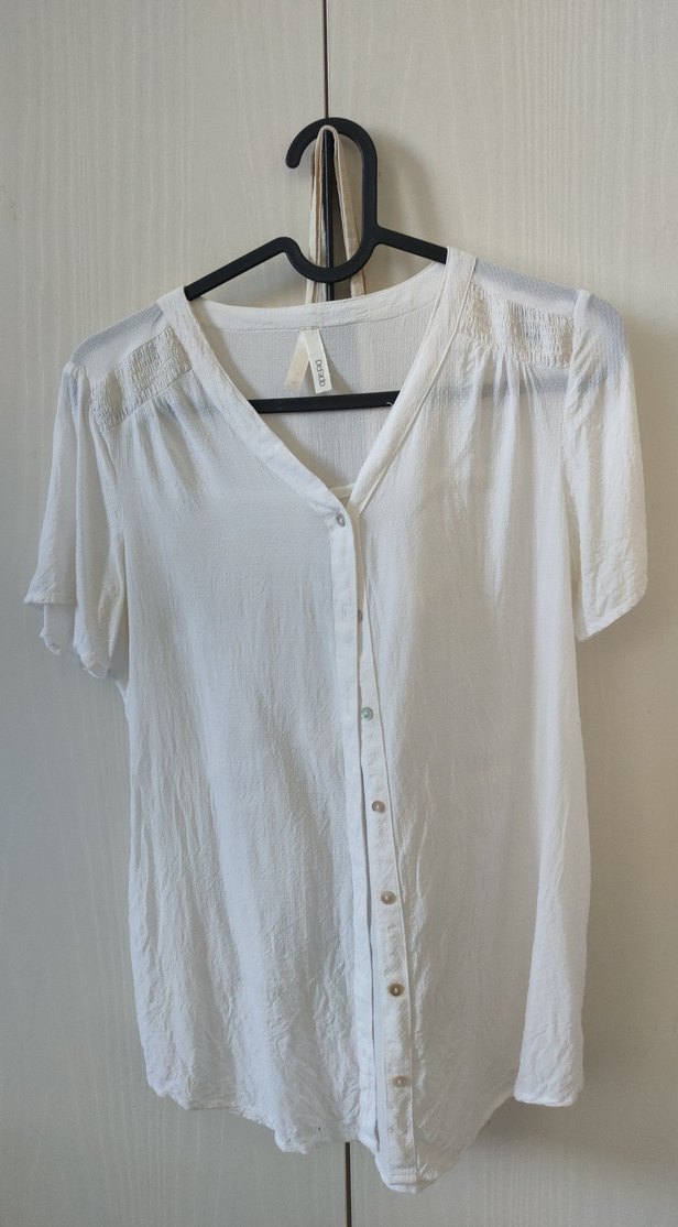 XXS yazıyor etiketinde ama S bedene de olur. Düğmeli, V yakalı, kısa kollu, beyaz kadın gömleği. Rahat kesimi, ince kumaşı ve sade tasarımıyla günlük kullanıma uygundur. Eteğinde ufak bir siyah leke var.