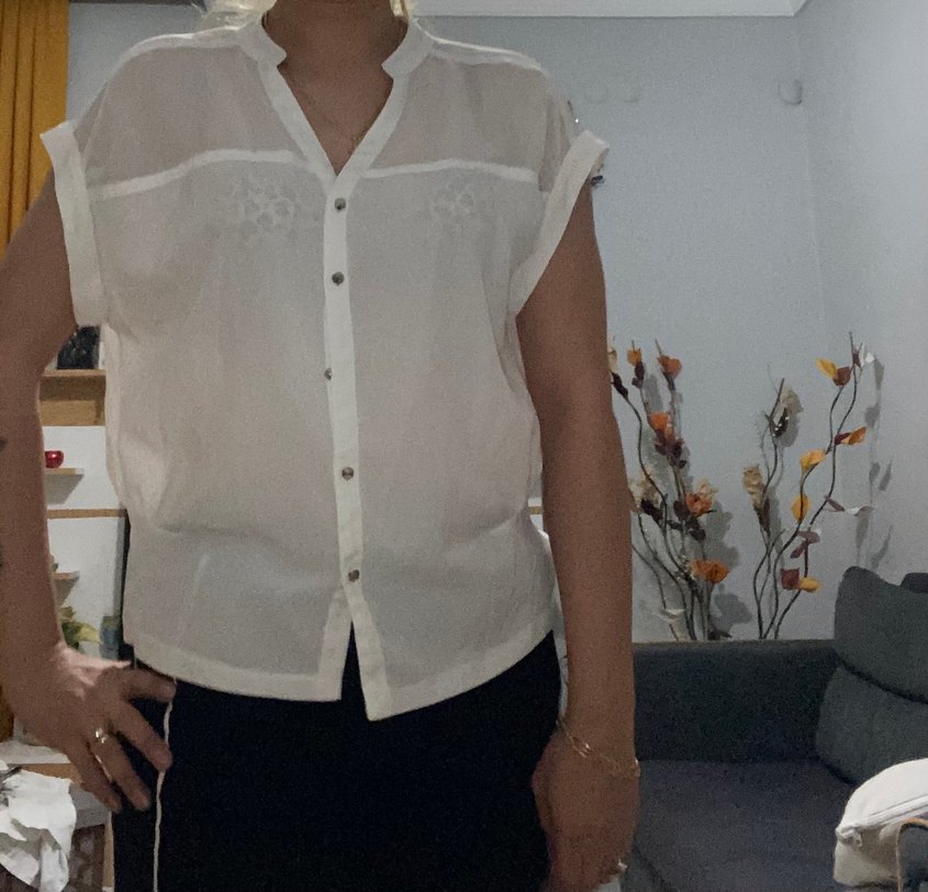 Pamuklu, düğmeli, V yakalı ve kısa kollu beyaz rahat kesim kadın gömlek. Günlük kullanıma uygun, casual tarzda.