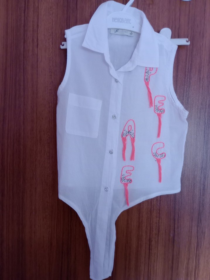 Kolsuz, V yakalı, düğmeli beyaz bluz; pastel nakış detaylarıyla, kısa ve bol kesim. Günlük sokak stili için uygundur.