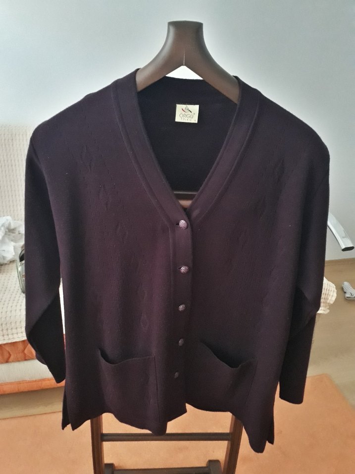 Düğmeli, cepli, V yakalı bordo hırka. Uzun kollu, bol kesim ve günlük kullanıma uygundur. Kalın kumaşı sayesinde üstte ceket gibi kalıplı durur. Çok çok az kullanıldı, yeni gibidir. Fazlalıktan satıyorum.