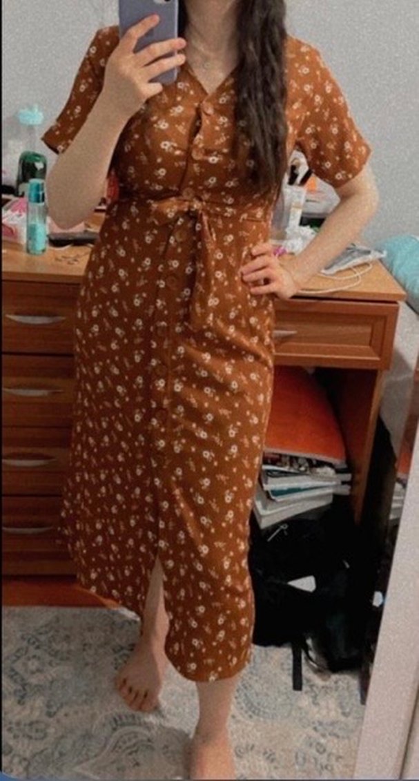 S-M beden olarak almıştım Kahverengi, V yakalı, lastik bel, kuşaklı, düğmeli midi boy elbise Ürün uzunluğu 118 cm(1-3 cm değişkenlik gösterebilir) Kol uzunluğu 22 cm Kumaş türü Polyamid Hiç giyilmedi, herhangi bir sorunu yok ( deniz Butik siparişimdi etiketlerde çıkmıyor)