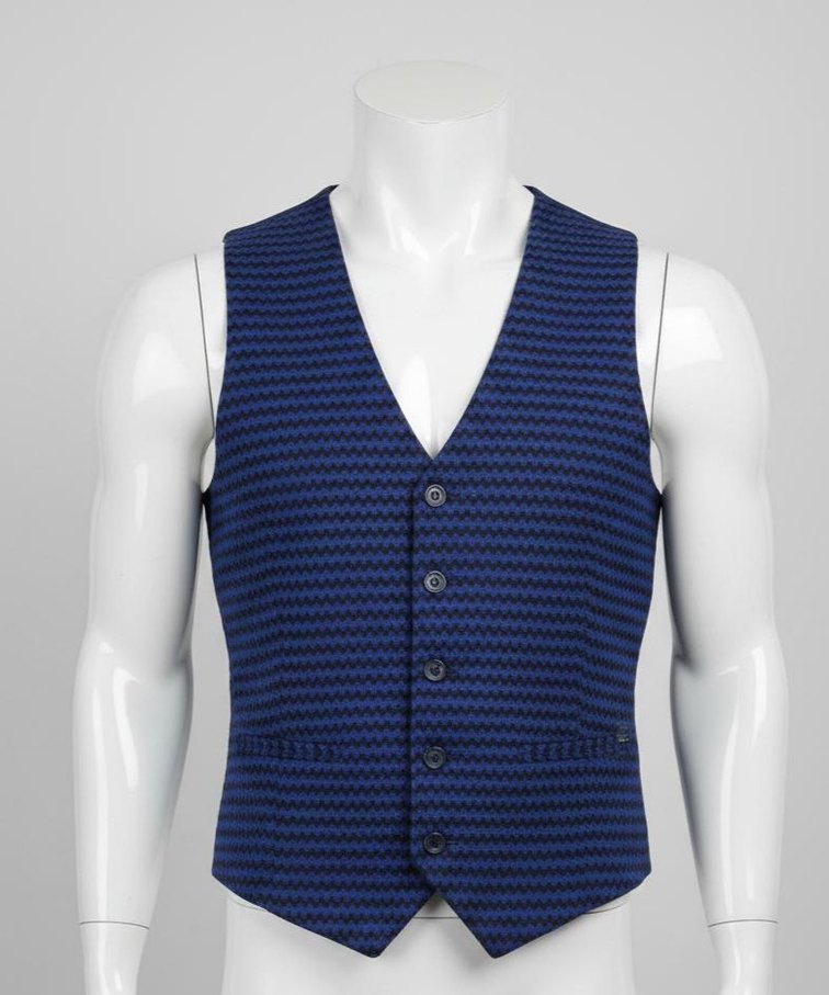 Düğmeli, V yakalı, kolsuz erkek yeleği. Koyu mavi batik desenli ve normal kesimdir. Ofis kullanımı için uygundur.