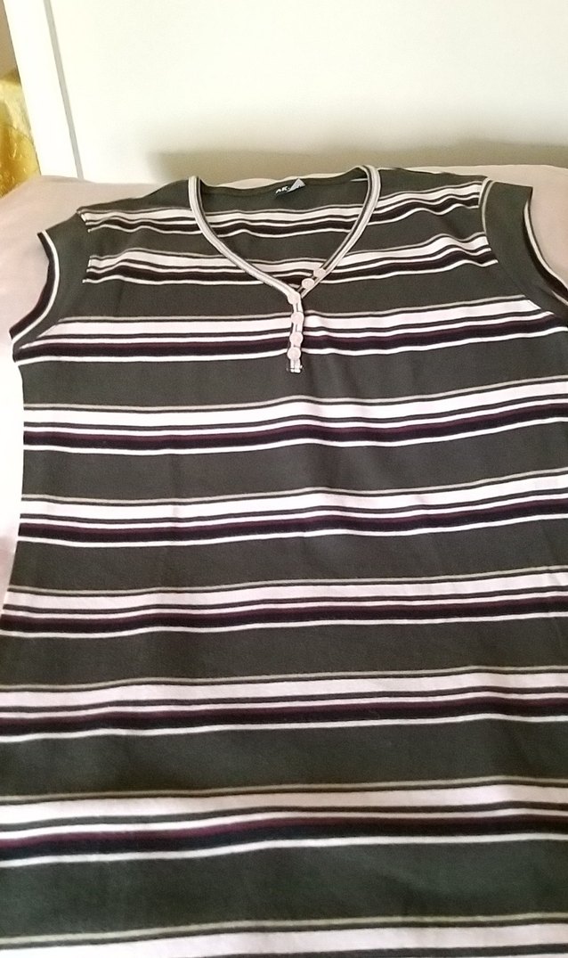 Düğmeli V yakalı, kolsuz gri çizgili bluz. penye kumaştan gögus53 boy71 uzunlukta ve dar kesimdir, günlük sokak stiline uygundur.