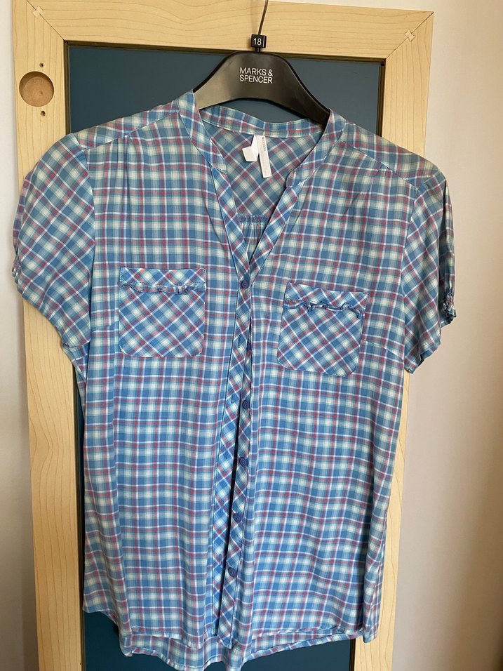 Pamuklu kumaştan, kısa kollu, düğmeli ve V yakalı, mavi-gri kareli desenli bol kesim kadın gömleği. Günlük rahat sokak stili için uygundur.