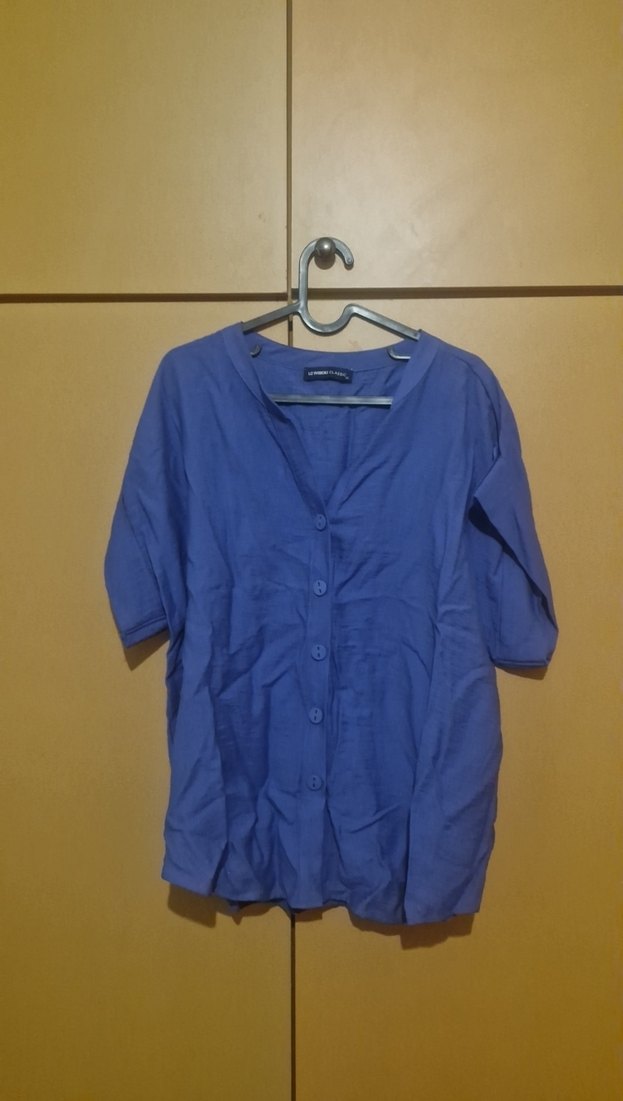 Düğmeli, koyu mavi, kısa kollu ve V yakalı bol kesim gömlek. Minimalist tarzda, günlük kullanım için uygundur.