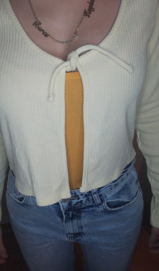 Düğmeli, V yakalı, fit kesim kadın hırka. Denim kumaştan, açık sarı renkte. Günlük sokak stiline uygun.