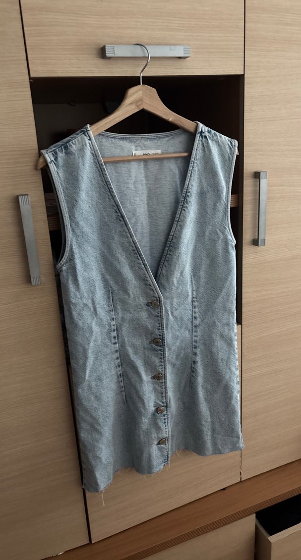 Düğmeli, V yakalı, kolsuz denim elbise . Mavi ve gri tonlarda, bol kesimli ve tie-dye desenli. Günlük rahat sokak stili için uygun.