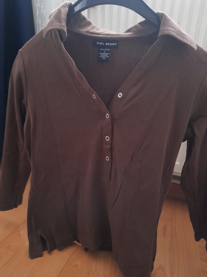 Yumuşak süet kumaştan yapılmış, uzun kollu, düğmeli ve V yaka kahverengi bol kesim hamile gömleği. Günlük rahat kullanım için uygundur.
