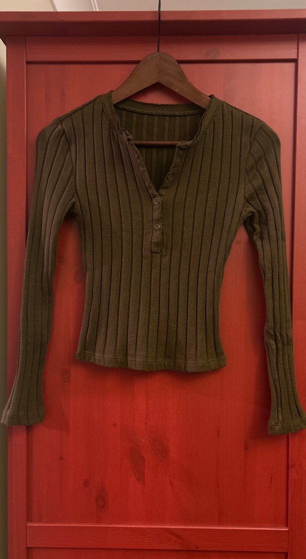 Düğmeli V yakalı, kahverengi triko kazak, uzun kollu ve midi boyda, günlük kullanıma uygun rahat bir modeldir.