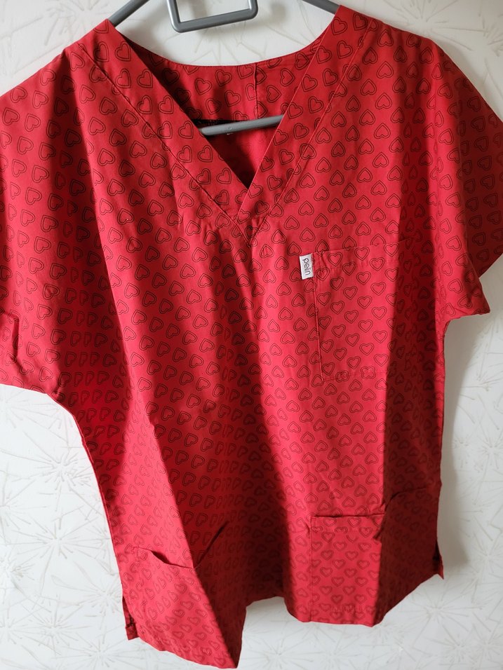Düğmeli, V yakalı kısa kollu kırmızı renkli kalp desenli, rahat kesim ve normal boyda, günlük kullanıma uygundur. ❤️