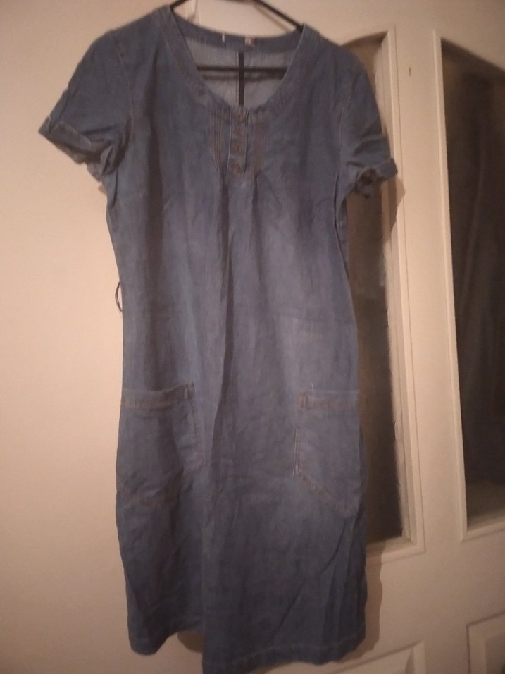 Lacivert kot kumaştan, V yakalı, kısa kollu ve düğmeli bu elbise, bol kesimi ve ön cep detaylarıyla günlük bohem tarz sunar.