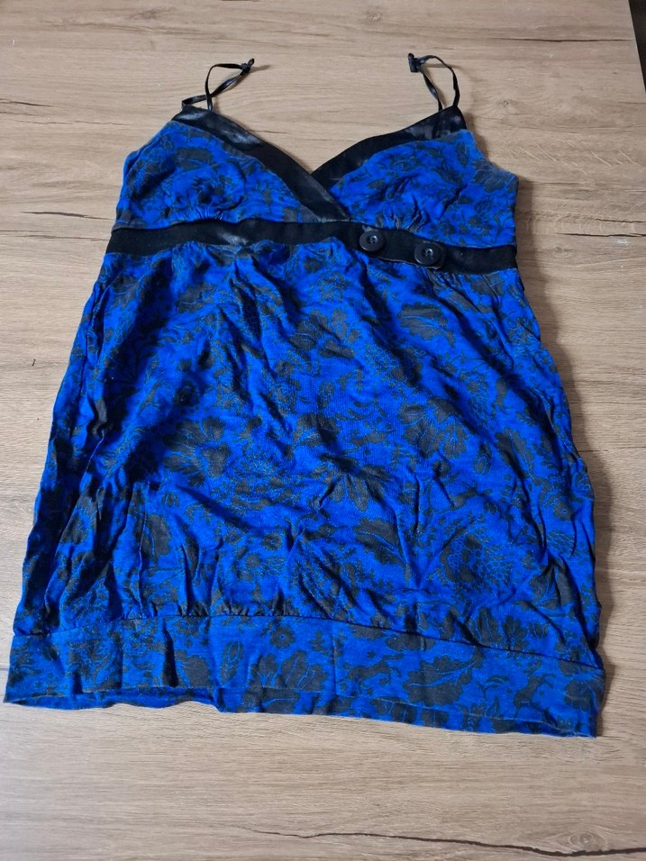 Düğmeli, V yakalı, mavi batik desenli, sentetik kumaştan yapılmış, salaş ve midi boy bir atlet. Açık hava sokak tarzına uygundur.